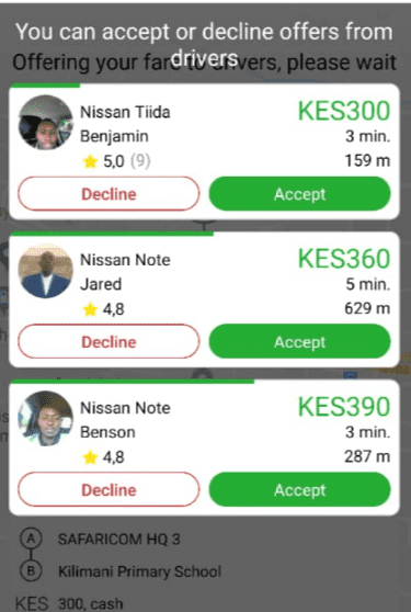 Initially, the app allowed passengers to set their own fair but this feature was misused by most clients who set as low as Sh 5 for as long as a 10km distance.