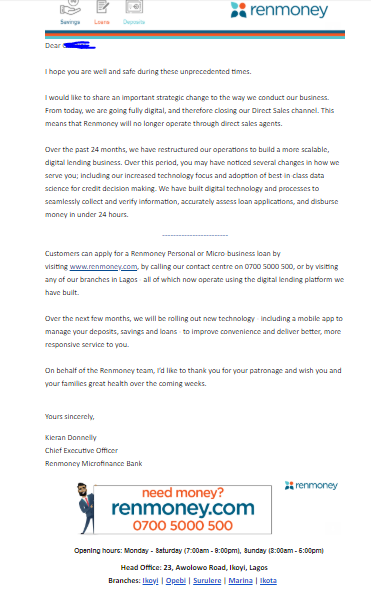 The members of staff affected were direct sales agents whose jobs involved working on the field to make sales. It seems a strategic decision by Renmoney as the startup will not have to pay the salaries of up to 391 direct sales agents stuck at home because of the lockdown that was in place at the time. It also signals a shift in the startup’s business model after the lockdown is lifted.